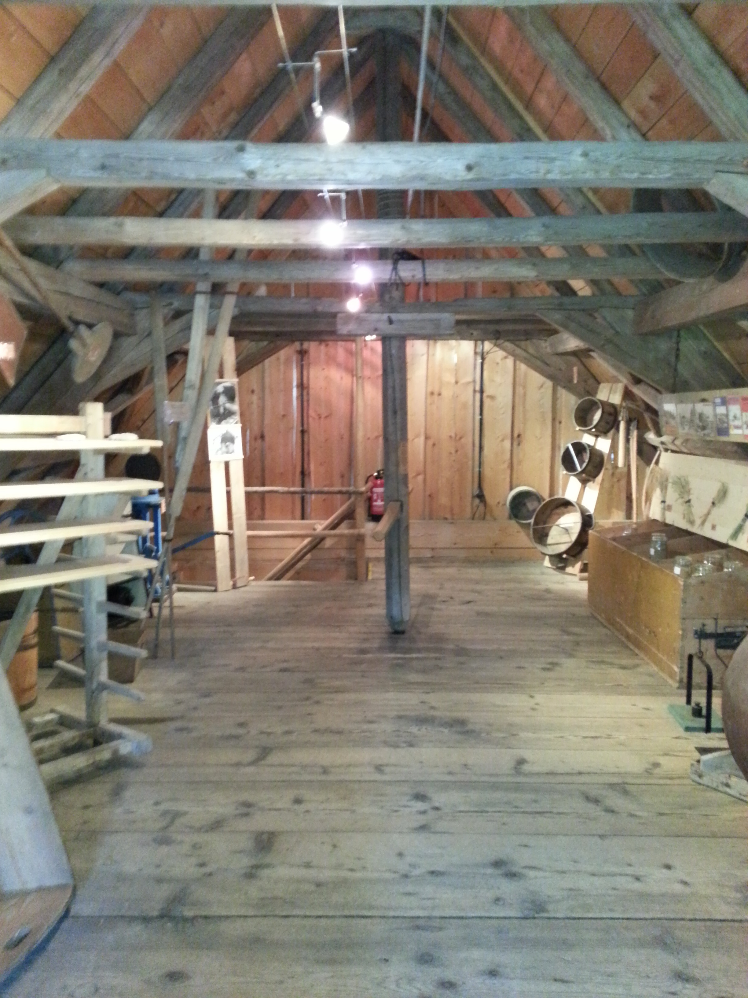 Im Dachgeschoss werden in der Ausstellung „Vom Korn zum Brot“, beginnend mit der Getreidereinigung bis zum fertigen Brot, alle Arbeitsschritte dargestellt.